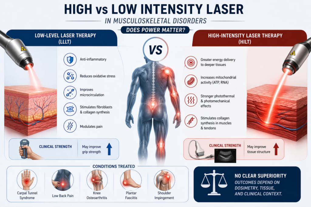 Photobiomodulation (PBM), including both low-level laser therapy (LLLT) and high-intensity laser therapy (HILT), has emerged as a non-invasive therapeutic strategy widely used in rehabilitation.While both approaches rely on light–tissue interactions to modulate biological processes, an important clinical question remains: does higher intensity translate into better outcomes?