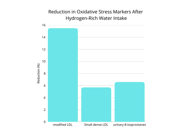 After 8 weeks of daily intake of hydrogen-rich water, participants showed significant reductions in markers related to oxidative stress and metabolic risk. Modified LDL cholesterol decreased by 15.5%, while small, dense LDL and urinary 8-isoprostanes were reduced by 5.7% and 6.6%, respectively.