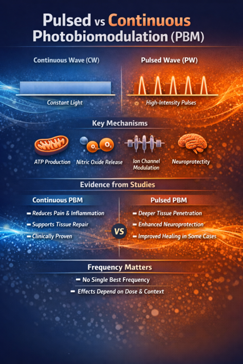 Photobiomodulation (PBM), also known as low-level laser therapy (LLLT), has been widely used for tissue repair, pain modulation, and inflammation control. However, a key unresolved question remains: should PBM be delivered in continuous wave (CW) or pulsed wave (PW) mode? This distinction may influence biological responses at cellular and systemic levels, and has been explored in the scientific literature over several decades.